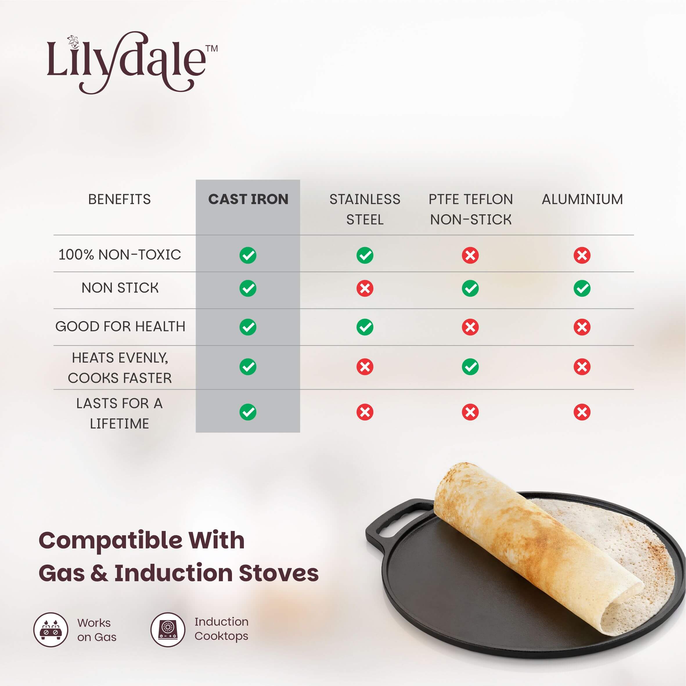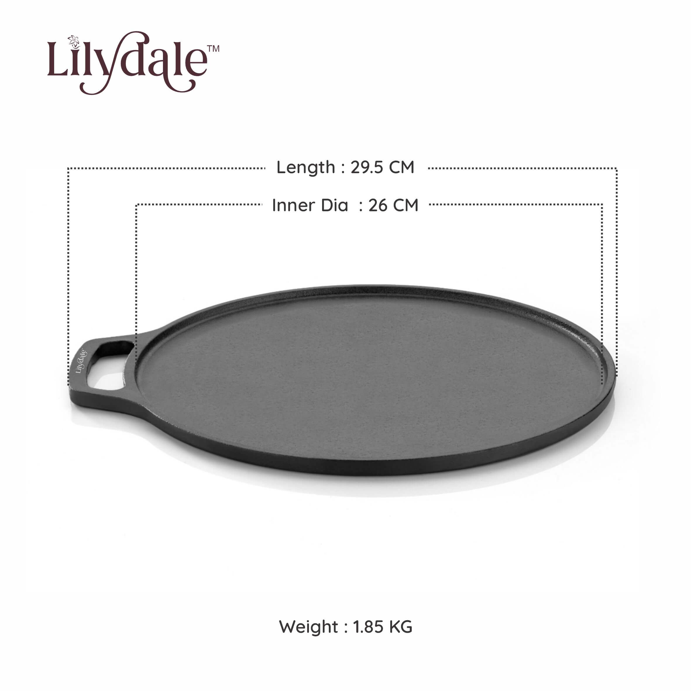Bring home the authentic taste of Indian cooking with the Pre-Seasoned Multiuse Cast Iron Dosa Tawa (26cm) – your all-in-one solution for making perfect dosas, chapathis, parathas, uttapams, and more. With a wide 10-inch cooking surface and sturdy double handles, this tawa delivers exceptional heat retention and durability while being compatible with both modern and traditional cooktops. Enjoy the timeless flavor, texture, and health benefits of traditional cookware — built to last for generations.