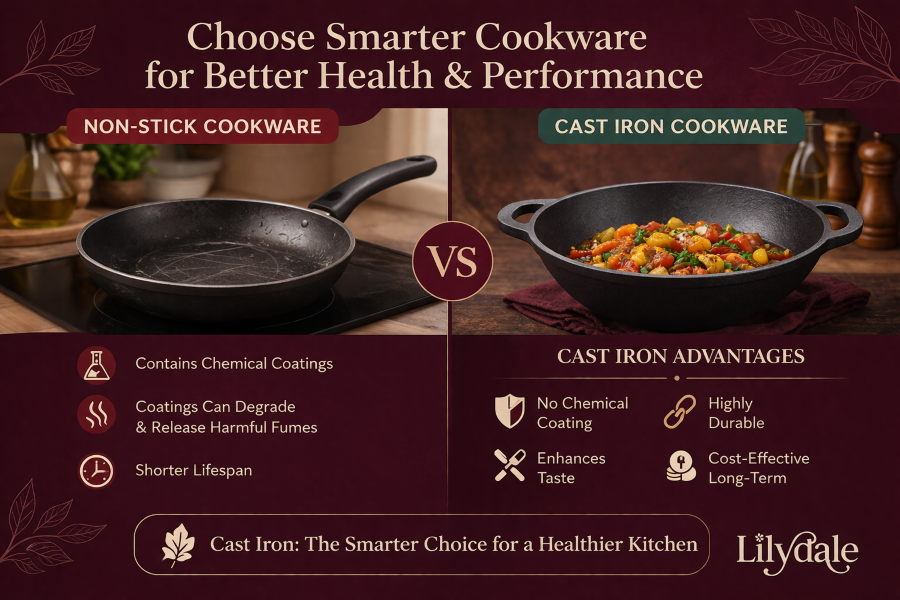 Say NO to Non-Stick, Say YES to Healthier Cooking with Lilydale Cast IronModern kitchens are filled with convenience-driven cookware, and non-stick tawa has become a common choice in many homes. It looks attractive, feels lightweight, and makes cooking seem effortless. At first glance, it appears to be the perfect solution for everyday cooking.
