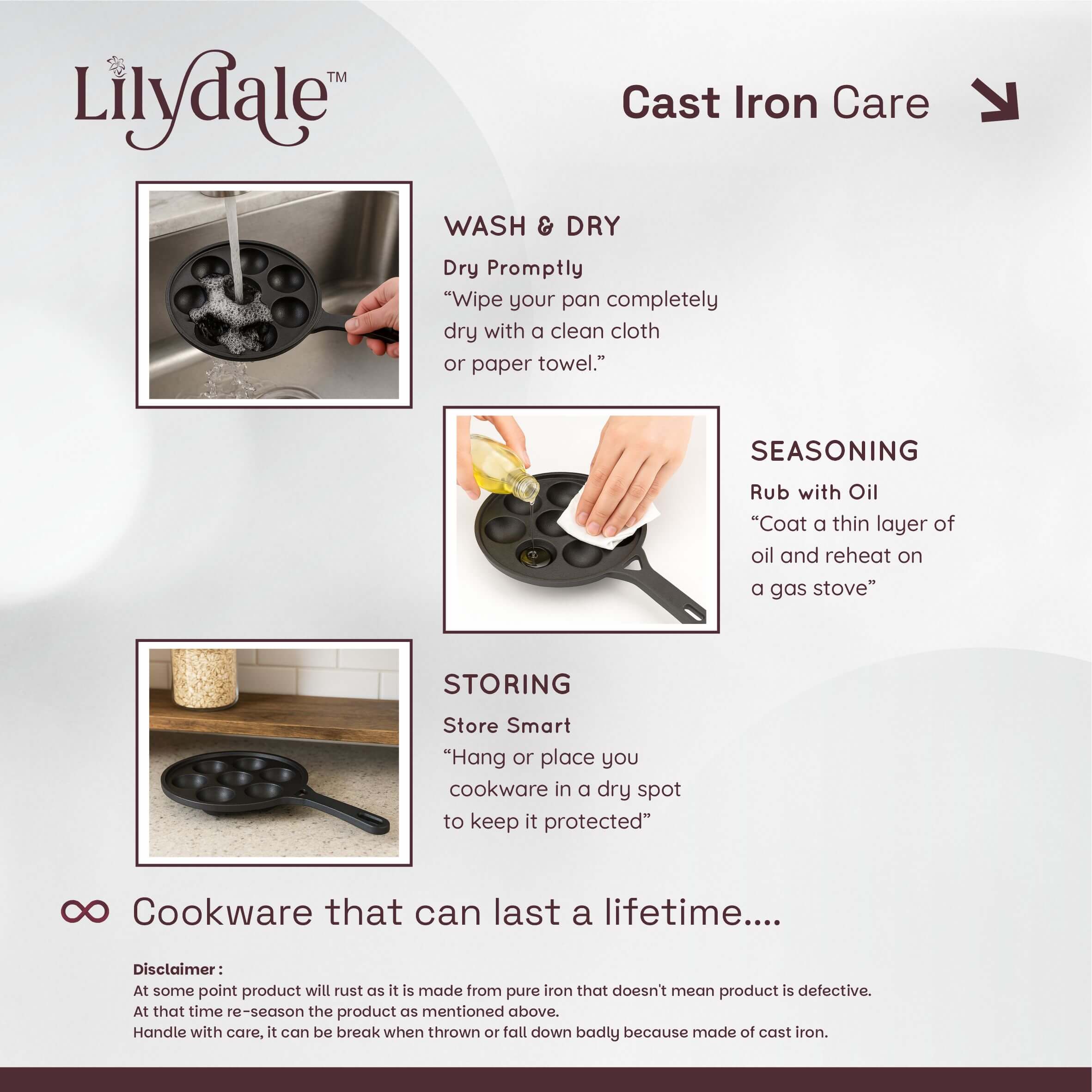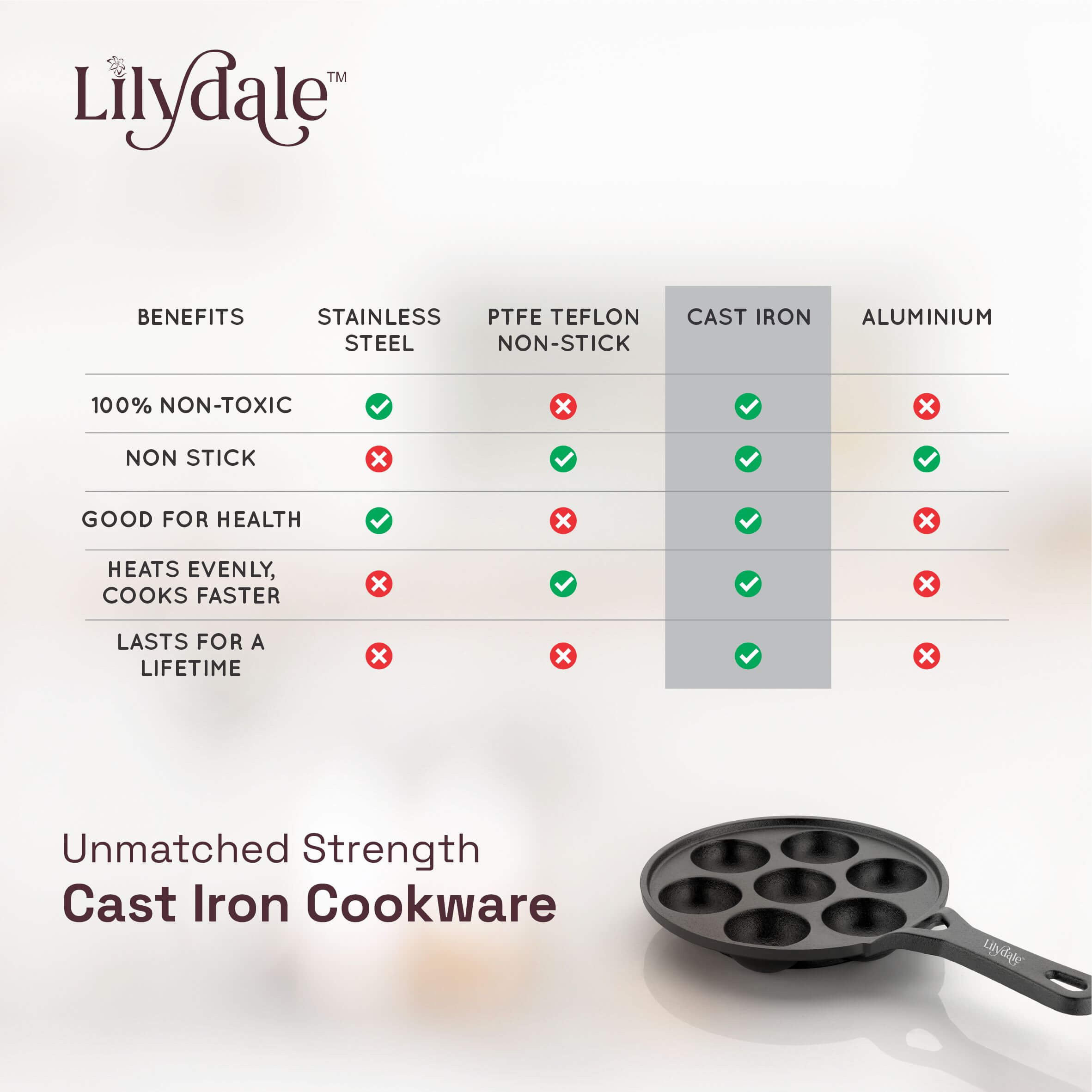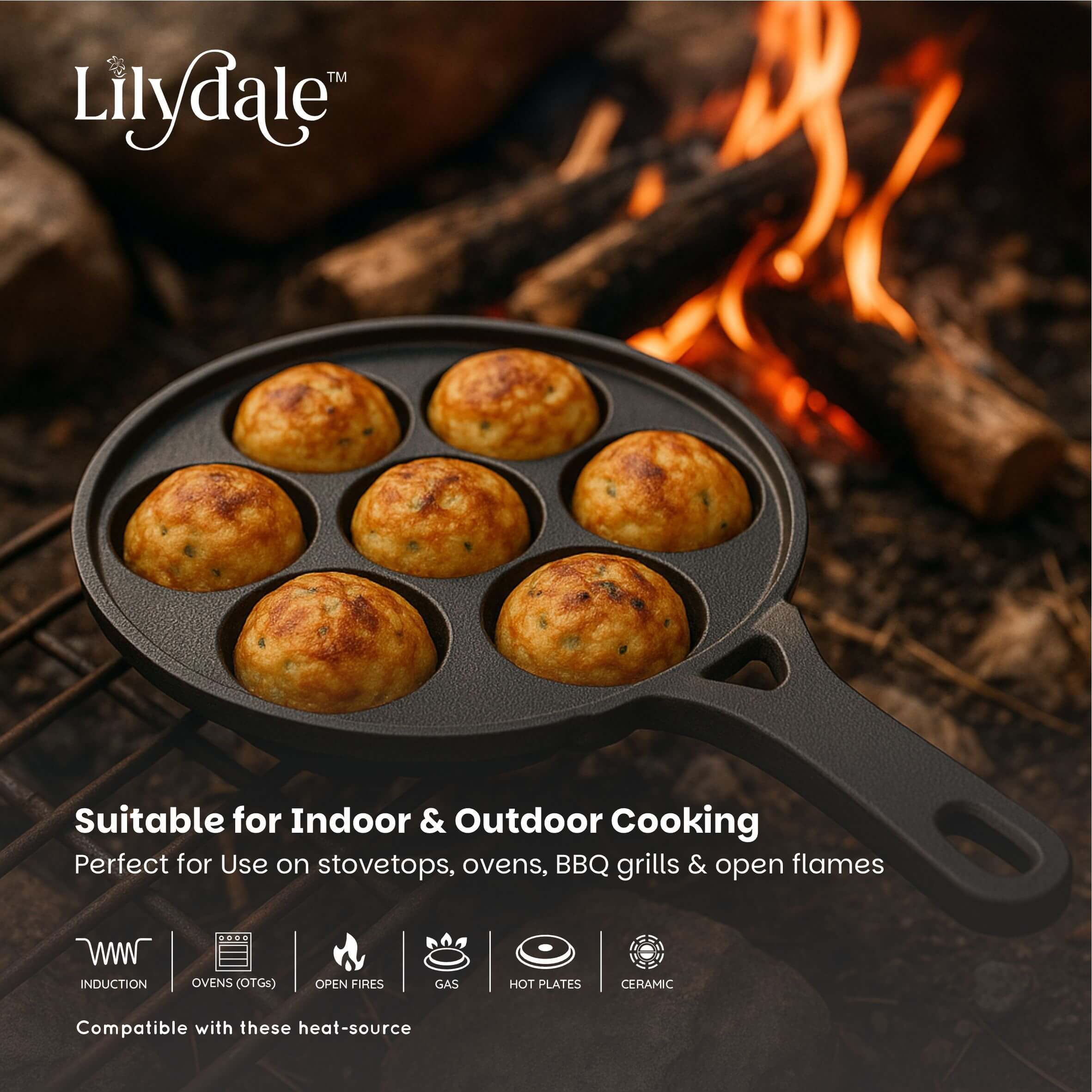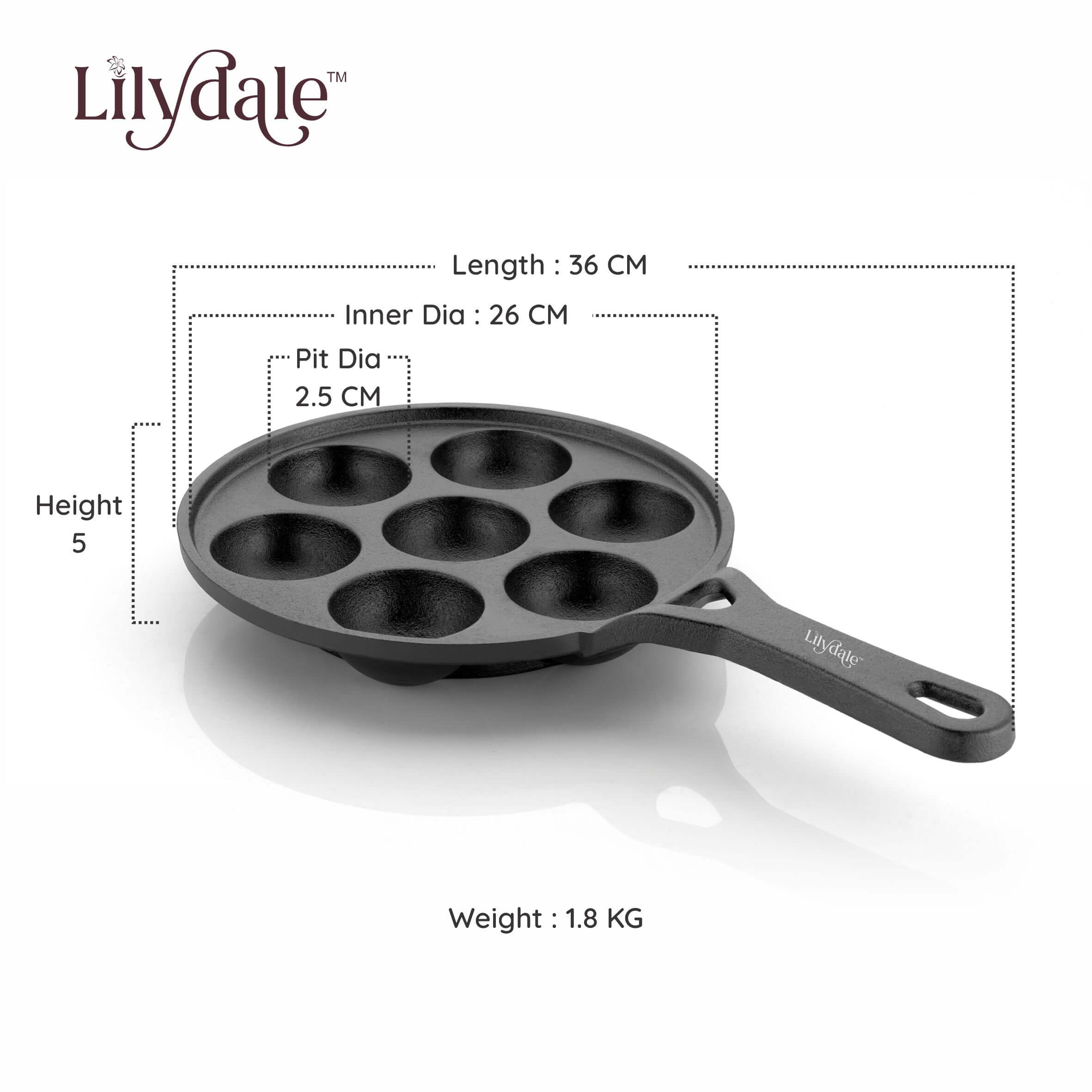 Lilydale 7Pits Cast Iron Appe/Unniyappam Chatty/Appam Pan/Ponganal/Paddu/Paniyarakkal/Litti Maker Handles/Paniyaram Stick 8.3"/21cm/1.8kg with Toxin-Teflon-Chemical Free PreSeasoned for Gas/Induction