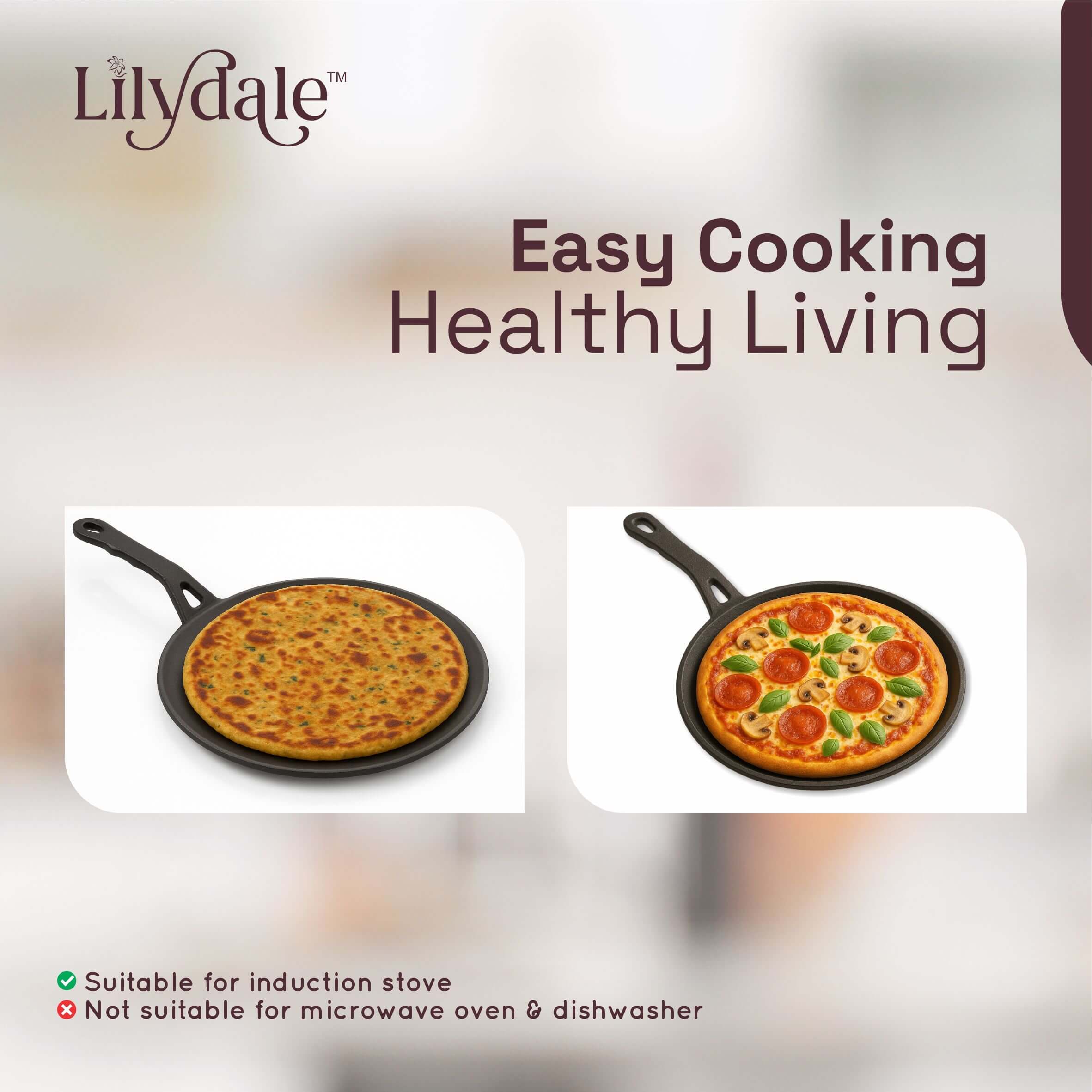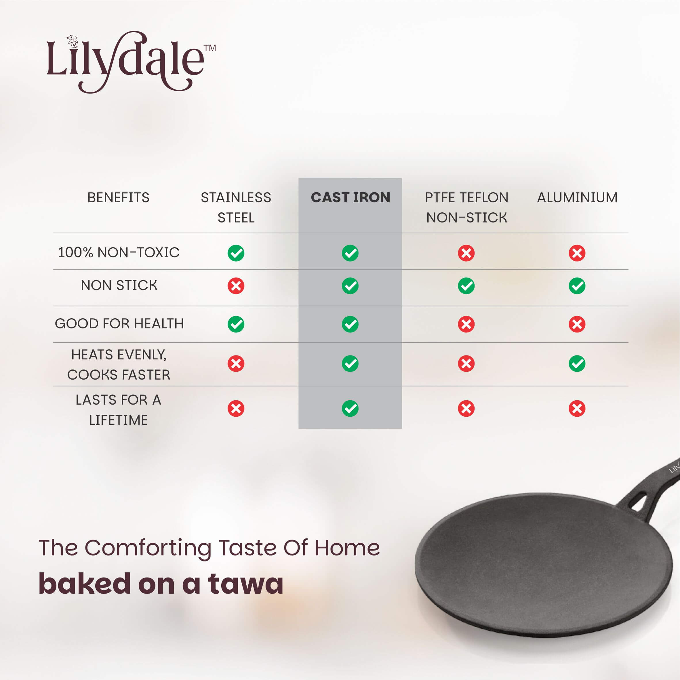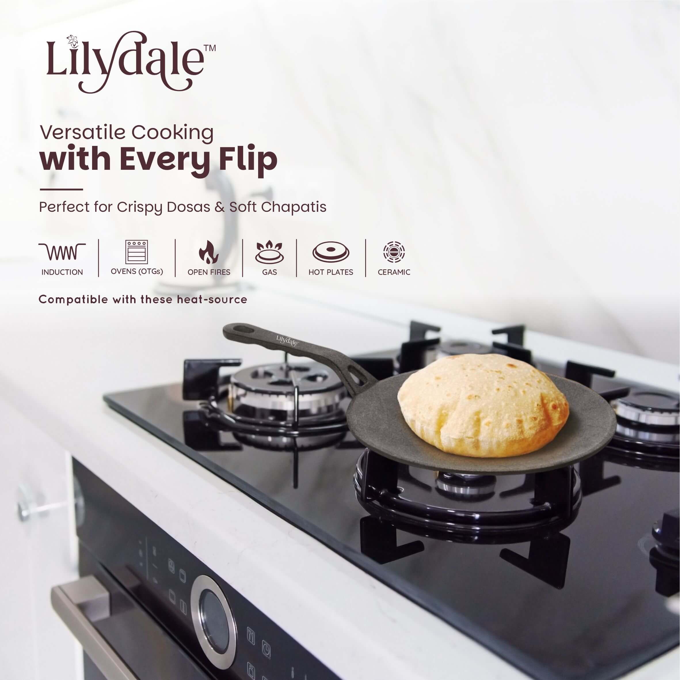 The Lilydale Cast Iron Roti Tawa (26cm / 10”, 2kg) is a durable and versatile flat pan designed for making perfectly cooked rotis, chapatis, naans, parathas, dosas, pancakes, tortillas, and flatbreads. Made from heavy-duty cast iron, it ensures excellent heat retention and even heat distribution for consistent cooking results. Pre-seasoned with natural vegetable oil, this tawa is 100% free from toxins, Teflon, and chemical coatings, making it a safe and healthy choice for everyday cooking. The ergonomic handle provides a firm and comfortable grip, while its sturdy design makes it suitable for gas stoves, induction cooktops, and open flames. Built to last for generations, the Lilydale Cast Iron Roti Tawa develops a natural non-stick surface over time, delivering authentic flavors and healthier meals with every use.