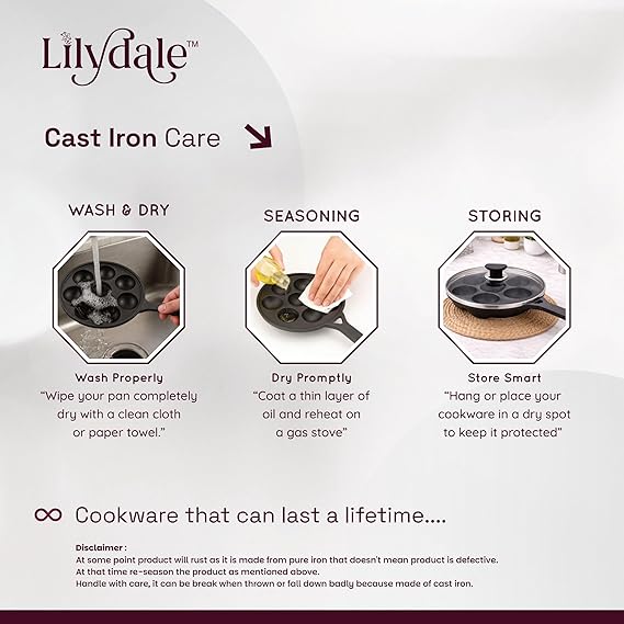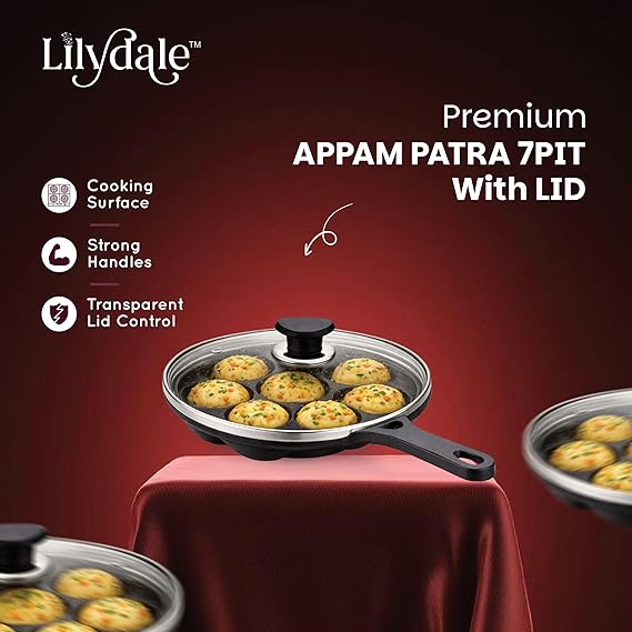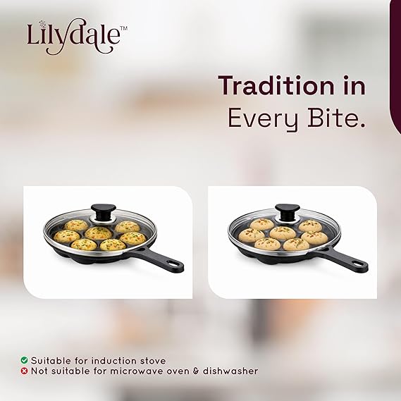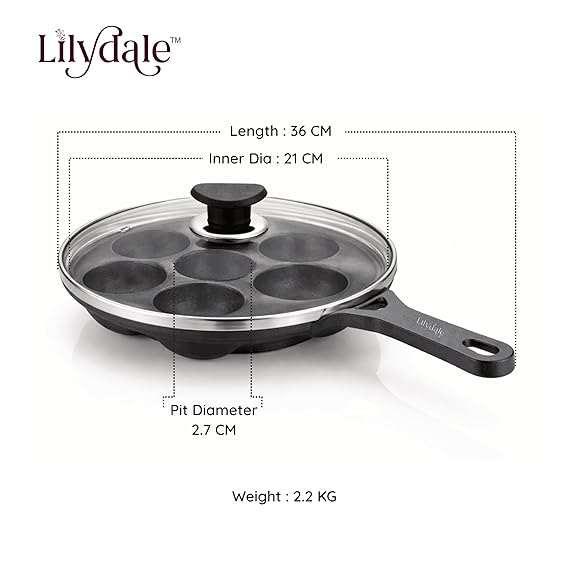 The Lilydale 7 Pits Cast Iron Appam Pan with Handles & Glass Lid is the perfect blend of tradition and convenience. Designed with 7 deep pits, it lets you prepare authentic South Indian favorites like appam, unniyappam, paddu, paniyaram, and litti with ease. Crafted from 100% pure cast iron, this pan ensures superior heat retention and even cooking for healthier, tastier dishes. Its dual-handle design provides a firm grip, while the transparent glass lid helps you monitor cooking without losing heat or flavor. Pre-seasoned for immediate use, it naturally becomes more non-stick with regular cooking and is completely free from toxins, Teflon, and harmful chemicals. Suitable for both gas stoves and induction cooktops, it offers versatility and durability for everyday cooking. Bring home the Lilydale Cast Iron Appam Pan and enjoy a lifetime of safe, traditional, and wholesome cooking.