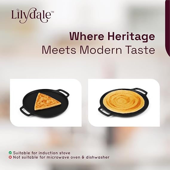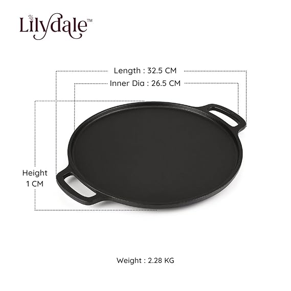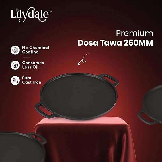 Lilydale Double Handles Dosa Tawa/Adakkal with Wooden Spatula 26cm/2200g/10.5/2.28kg Cast Iron 100% Toxin-Teflon-Chemical Coating Free PreSeasoned Multiuse Long-Lasting Gas/Induction Compatible