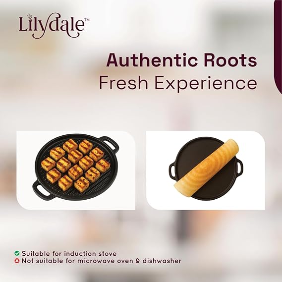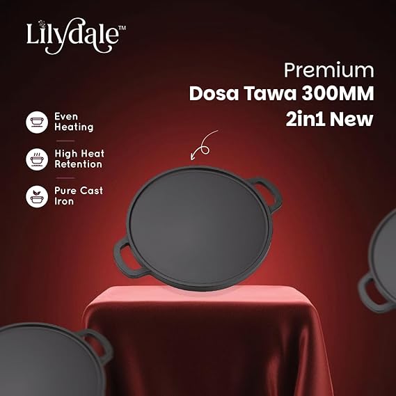 Bring home the traditional taste of Indian cooking with the Lilydale Double Handles Cast Iron Dosa Tawa/Adakkal with Wooden Spatula (30cm / 12” / 3kg) — a perfect blend of strength, safety, and performance. Crafted from premium-quality, pure cast iron, this tawa ensures even heat distribution for consistently crisp and golden dosas, rotis, chillas, and parathas every time. Unlike non-stick cookware, this 100% toxin-free, Teflon-free, and chemical-coating-free tawa offers a natural and healthy cooking experience. It comes pre-seasoned with vegetable oil, providing an easy-release surface that only gets better with use. The double-handle design ensures a firm and comfortable grip, making it safe and convenient to handle even when hot. Built to last for generations, the Lilydale cast iron tawa is highly durable, multiuse, and suitable for both gas and induction cooktops. Its heavy base retains heat longer, reducing cooking time and saving energy. The included wooden spatula adds a rustic charm while protecting the tawa’s surface from scratches. Whether you’re preparing traditional dosas, crispy uttapams, or perfectly roasted chapatis, this versatile cookware brings authentic flavor and unmatched durability to your kitchen — the way cooking was meant to be.