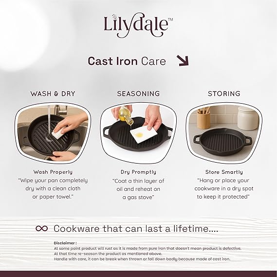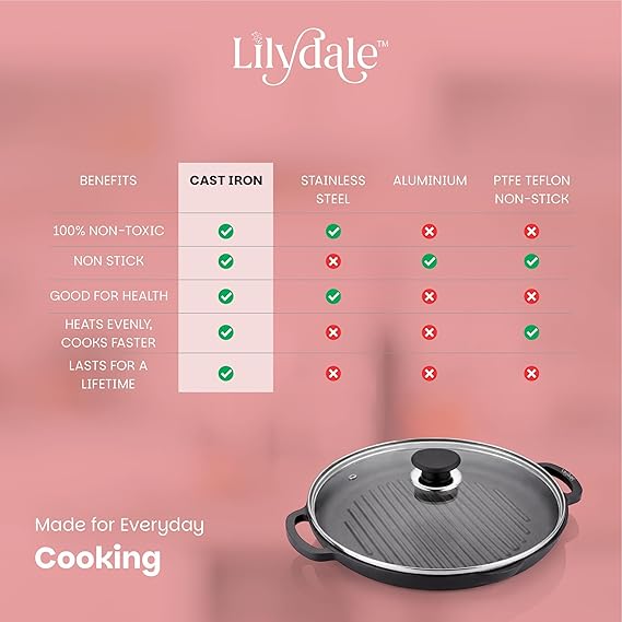 Experience authentic cooking with this Cast Iron Frying and Grilling Pan — designed for durability, performance, and healthy cooking. Measuring 24.5 cm (10"), this pre-seasoned cast iron pan delivers even heat distribution for perfect searing, frying, or grilling every time. With a 2.3L capacity and a sturdy 2.27 kg build, it retains heat beautifully for consistent results on gas, induction, or electric cooktops. The set includes comfortable handles, a tempered glass lid for easy monitoring, and a wooden spatula for safe, scratch-free use. Free from toxins, Teflon, and harmful chemicals, this pan is 100% natural and ready for everyday cooking. Ideal for everything from crispy vegetables to juicy steaks — built to last a lifetime and improve with every use.