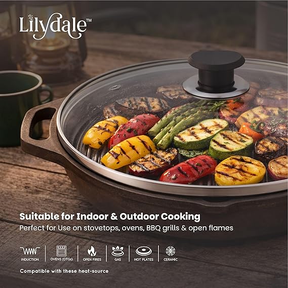 Lilydale Cast Iron Frying/Grilling Pan Handles with Glass Lid/Wooden Spatula 24.5cm/10"/2.27kg/2.3L PreSeasoned 100%Toxin-Teflon-Chemical Free Even Heat Distribution Gas/Induction Compatible Cookware