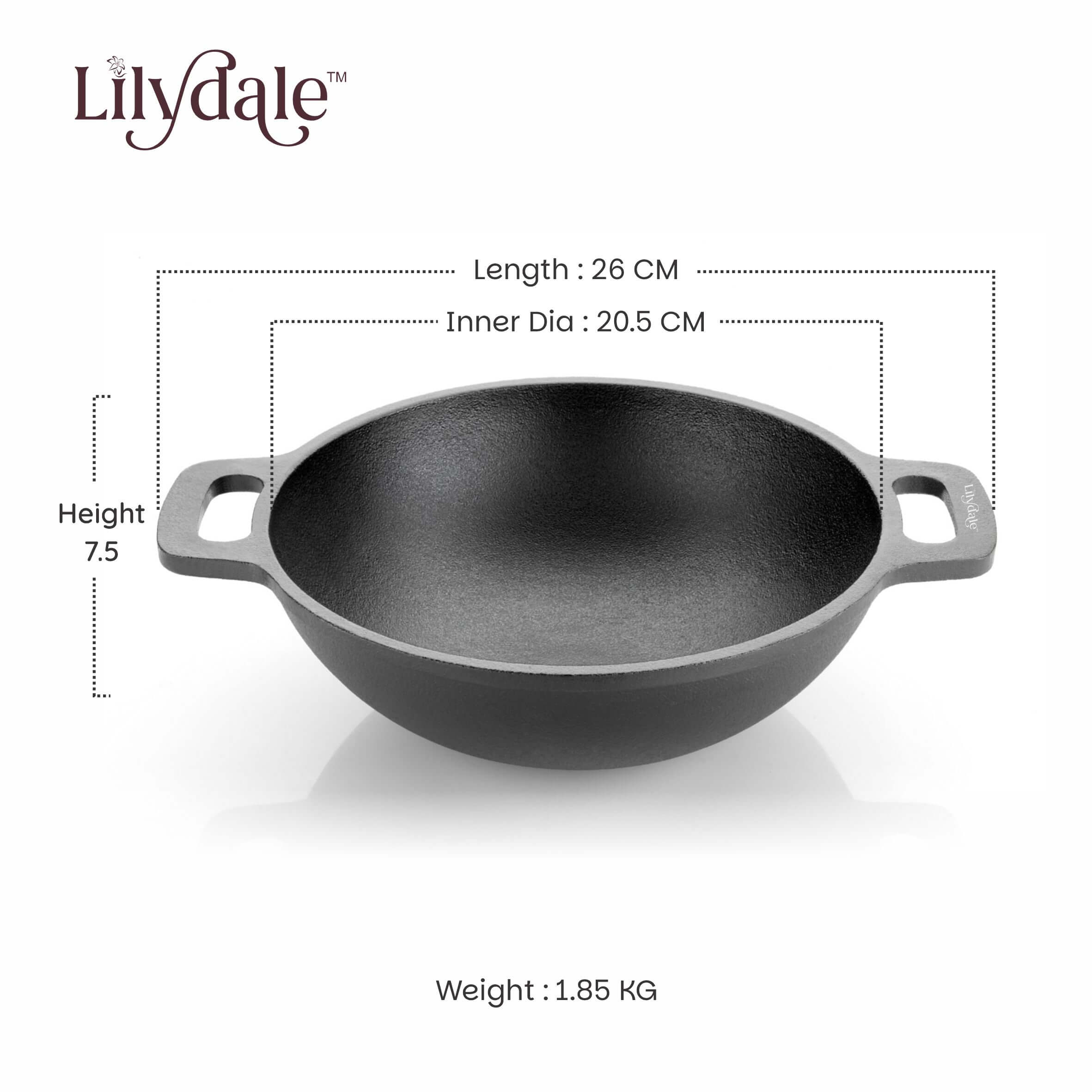 Lilydale Cast Iron Small Curved Handles Kadai with Wooden Spatula 20cm/8"/1.7kg/2L 100% Toxin-Teflon-Chemical Coating Free PreSeasoned Multiuse Gas Induction Friendly Cooking/Searing/Stewing