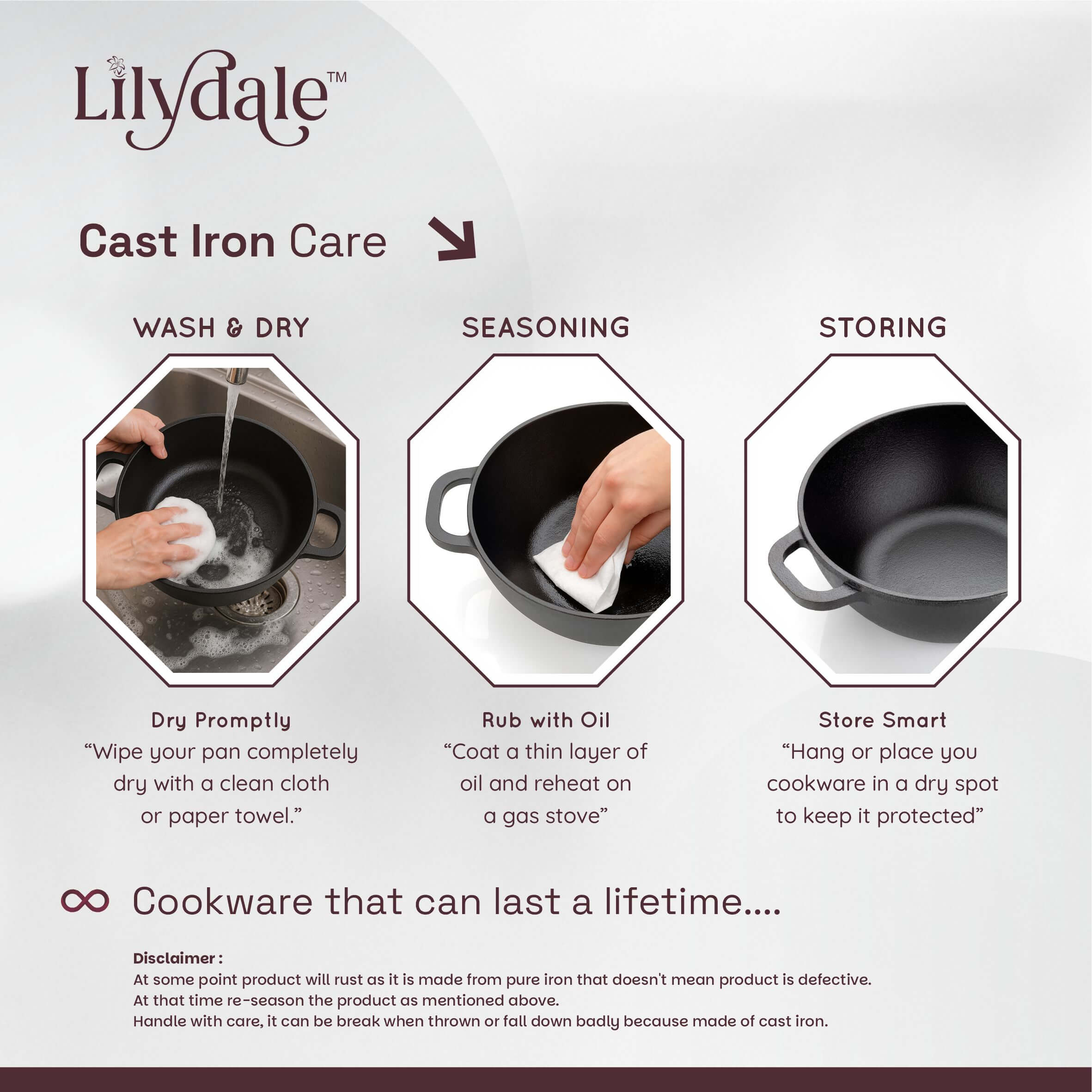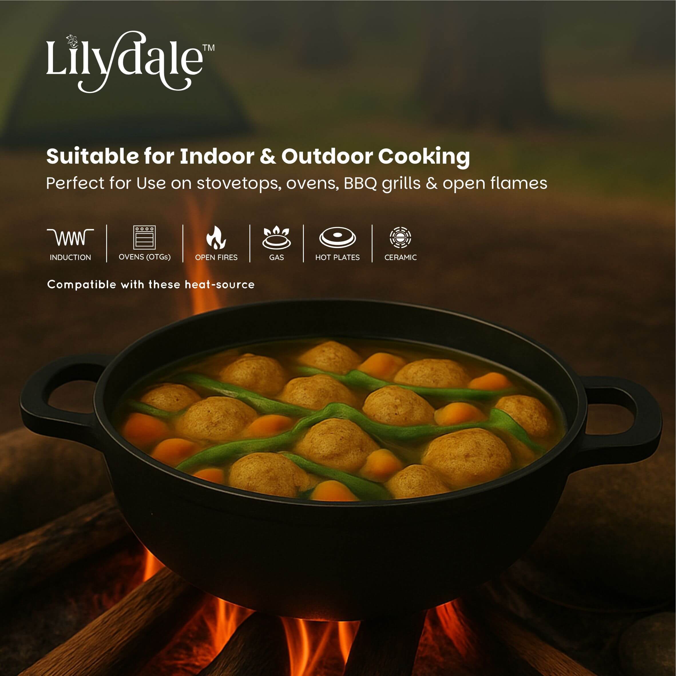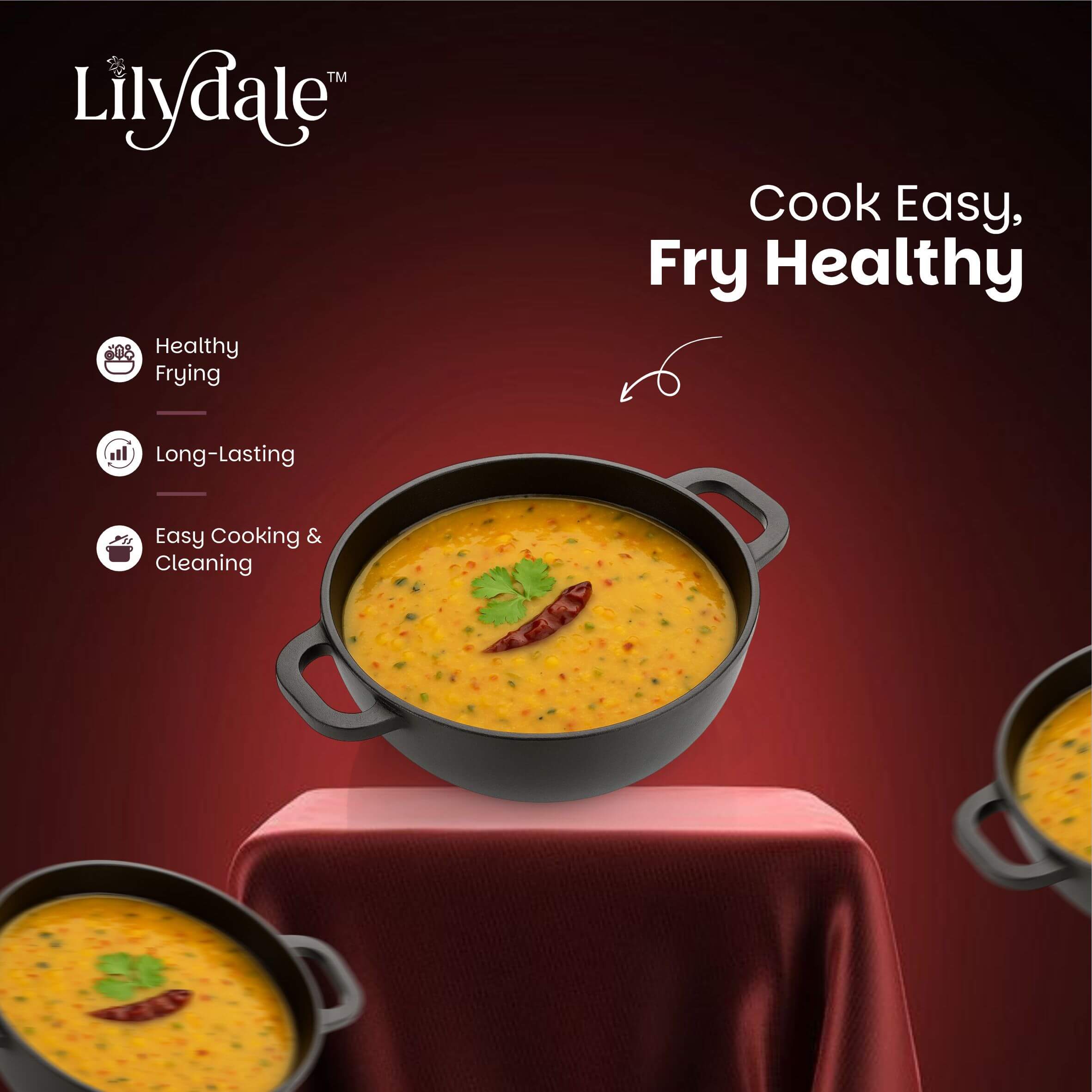 Lilydale Cast Iron Small Curved Handles Kadai (24cm/9.5", 2.65kg, 3L) is a durable, pre-seasoned cookware designed for authentic cooking. Made from 100% toxin, Teflon, and chemical coating–free cast iron, it naturally enhances flavors while ensuring safe and healthy meals. Its curved dual-handle design makes it easy to lift and serve, while the heavy-duty build retains and distributes heat evenly. Compatible with gas stoves and induction cooktops, this versatile kadai is perfect for searing, stewing, frying, and preparing dishes like biryani, sabzi, and rich gravies.