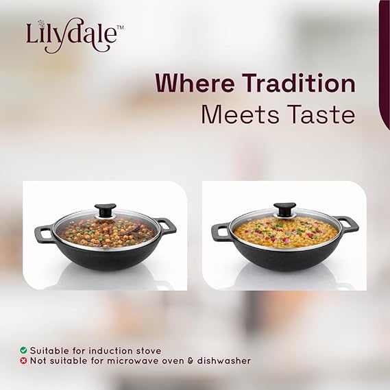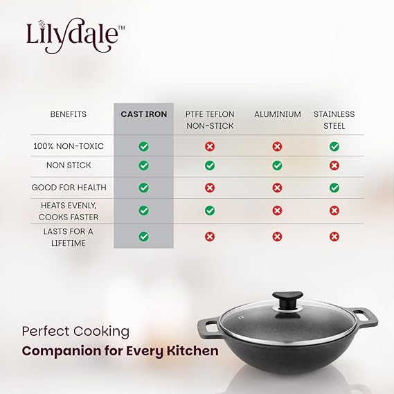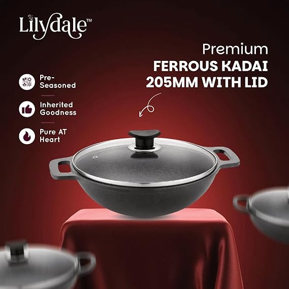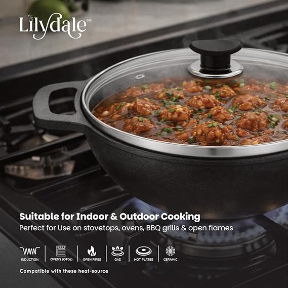 Lilydale Cast Iron Small Kadai with Handle/Glass Lid/Wooden Spatula 20.5cm/8"/2.25kg/2.5L 100% Toxin-Teflon-Chemical Coating Free PreSeasoned Multiuse Gas Induction Friendly Cooking/Searing/Stewing