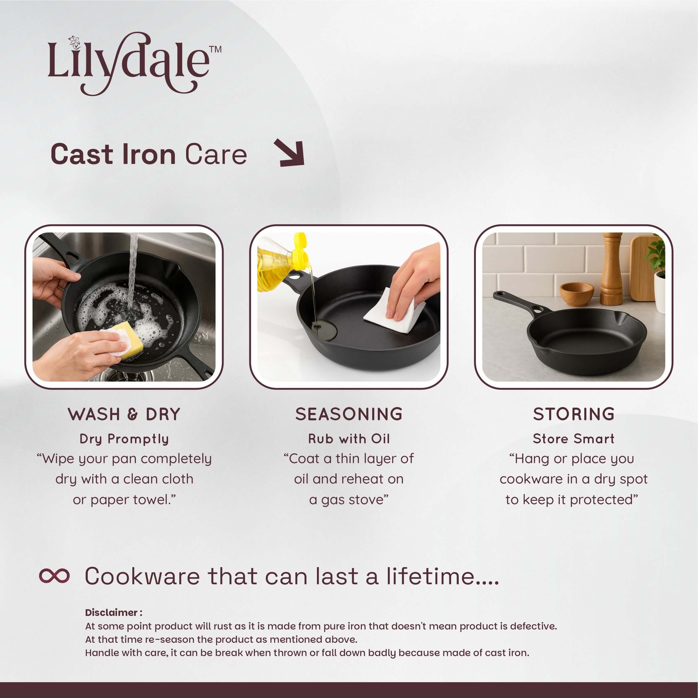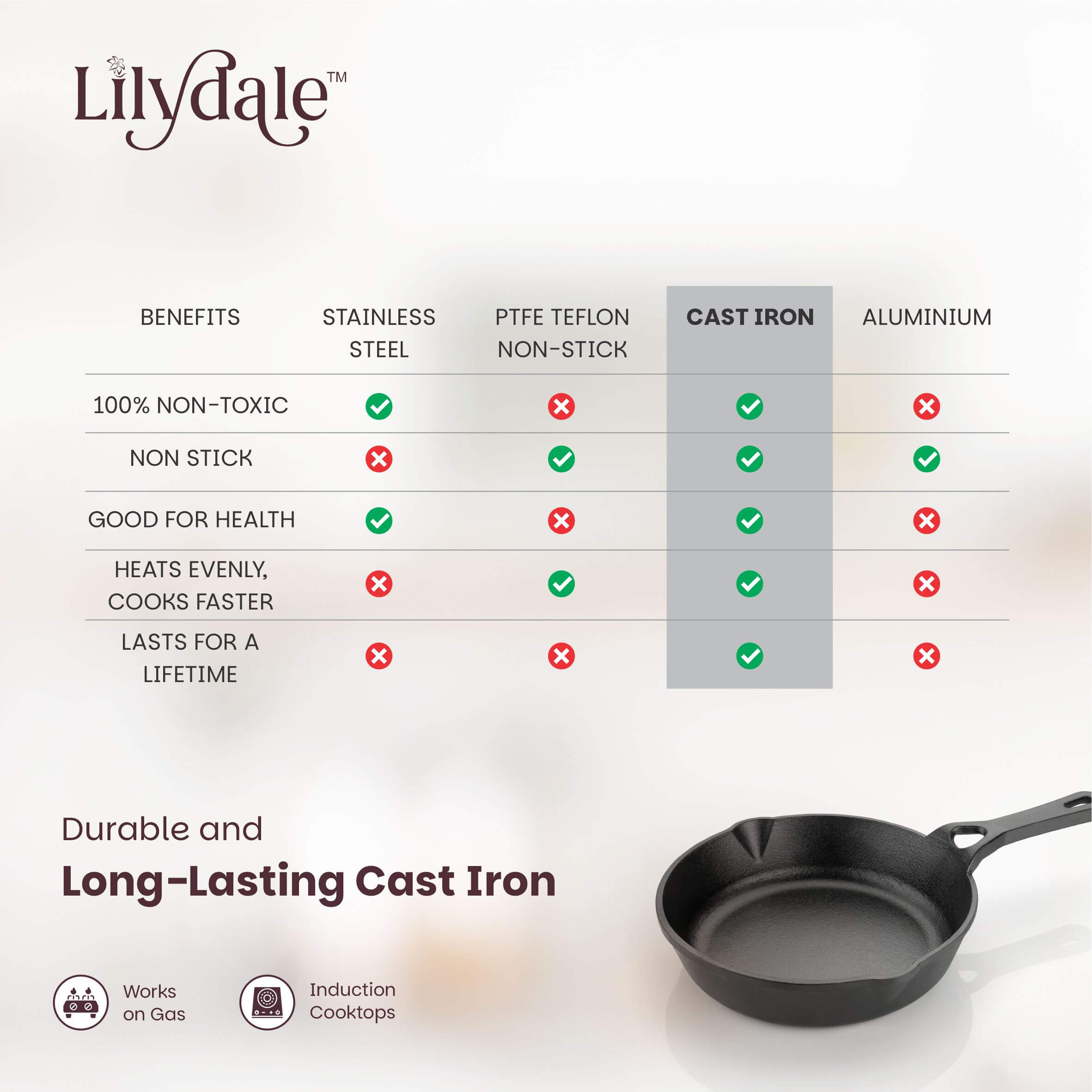 - Built to Last a Lifetime Thick and durable cast iron body resists warping and damage. Becomes better with every use — the natural non-stick surface improves over time as seasoning builds up.
